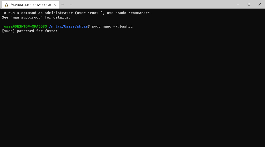 아래 명령어를 입력하여 ~/.bashrc를 엽니다.